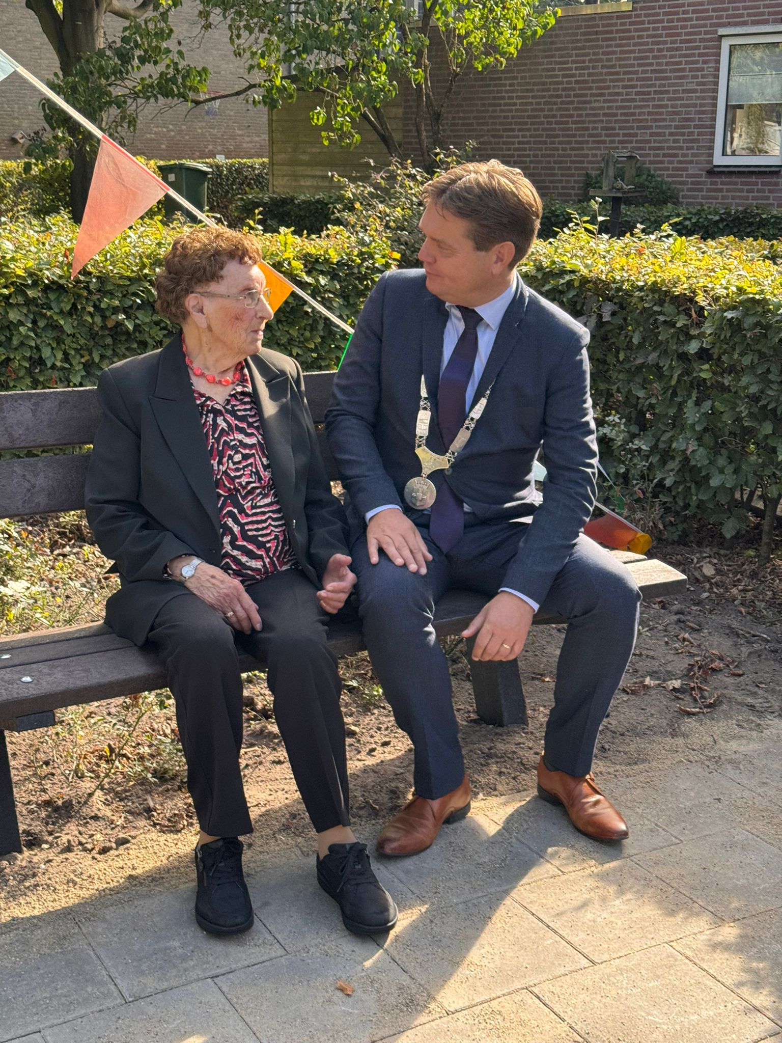 Met familie, buren en bekenden kwamen we samen tegenover haar woonhuis aan de Kloostertuin. Het werd een gezellig en feestelijk samenzijn. Het bankje is een blijvend eerbetoon én een plek waar ontmoeting en herinnering samenkomen. Gefeliciteerd met deze bijzondere mijlpaal, mevrouw van den Boogaard – Marinussen!