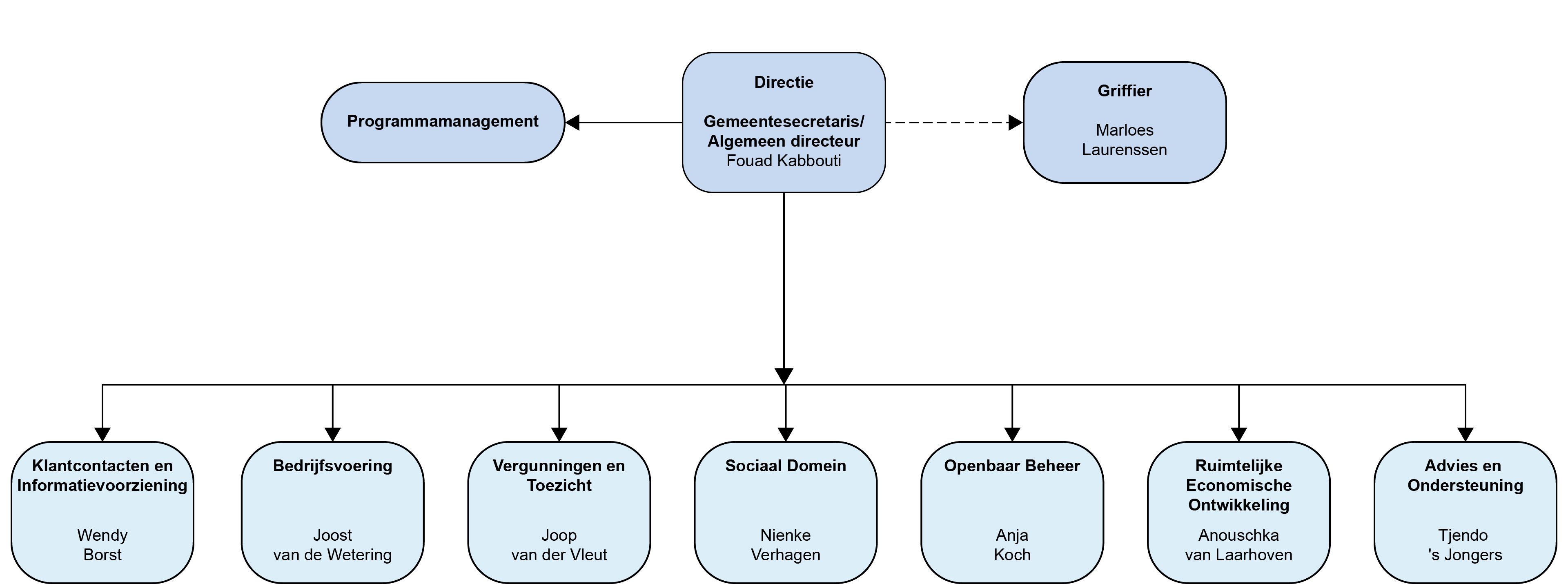 De ambtelijke organisatie staat onder leiding van de gemeentesecretaris en algemeen directeur. Deze persoon is ook de adviseur van het college van burgemeester en wethouders.