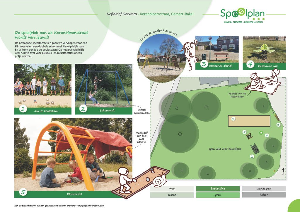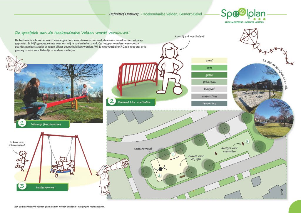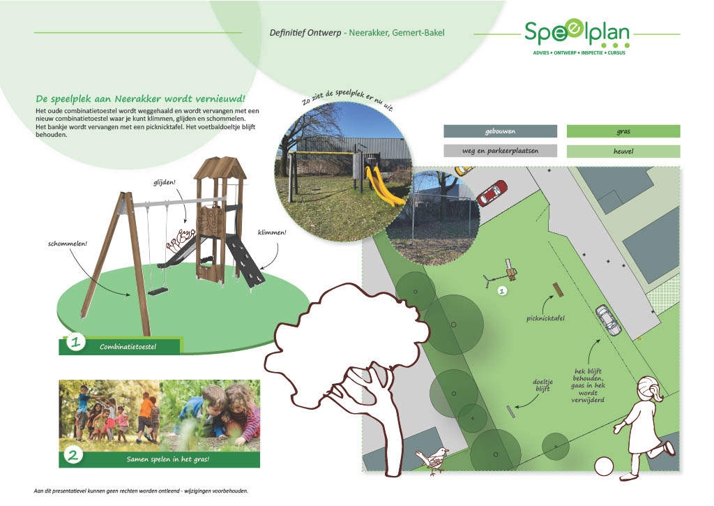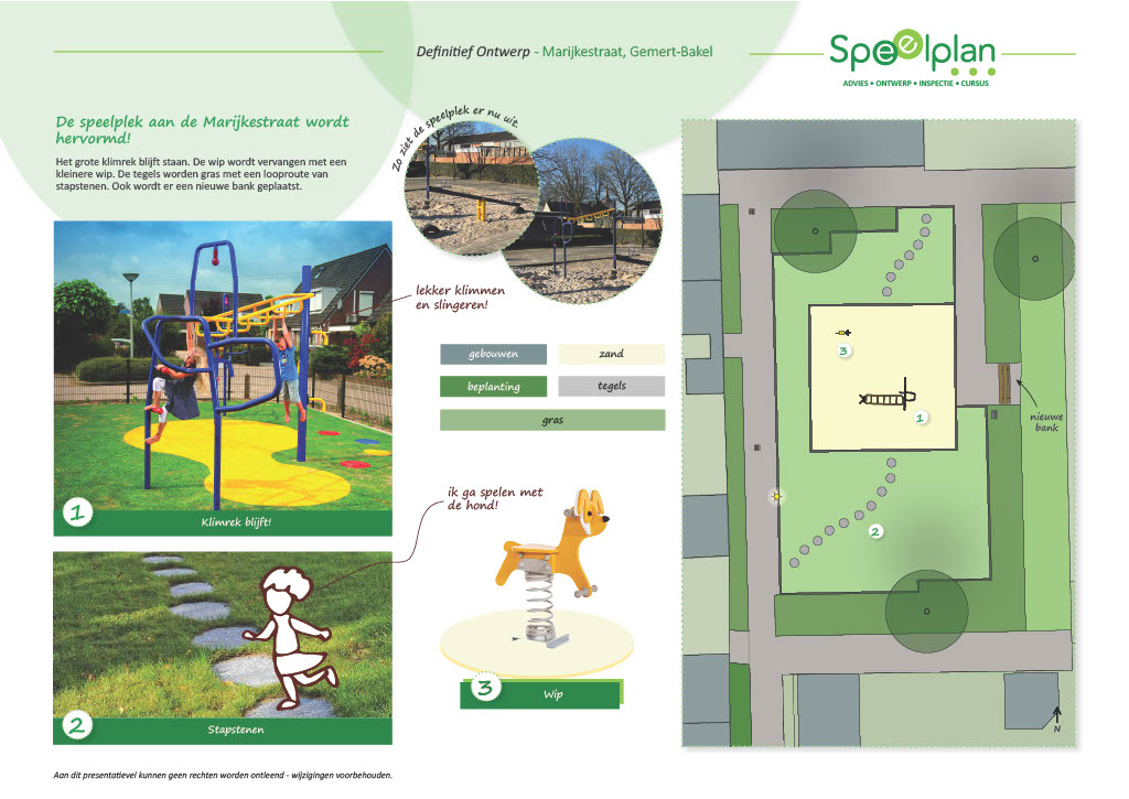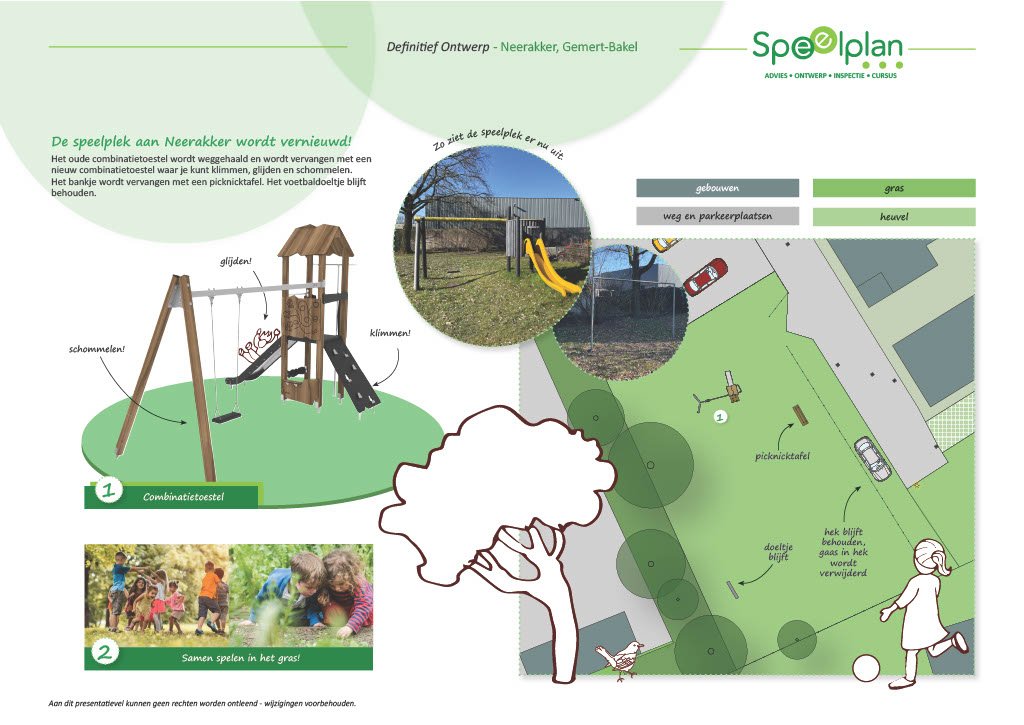 We gebruiken deze input om ontwerpen te maken voor de nieuwe speelplekken. We proberen zoveel mogelijk rekening te houden met de wensen van de buurt. Het ontwerp wordt binnenkort gedeeld op onsgemertbakel.nl, het digitale dorpsplein. Op die manier kan iedereen het bekijken en erop reageren.Â