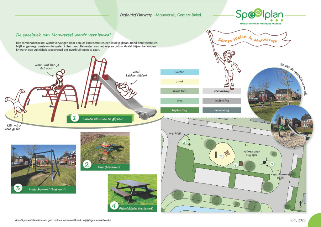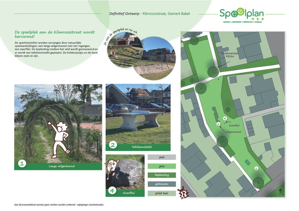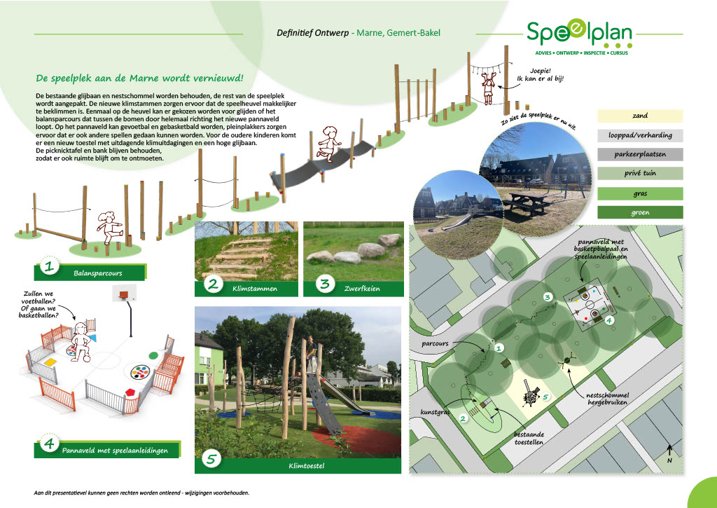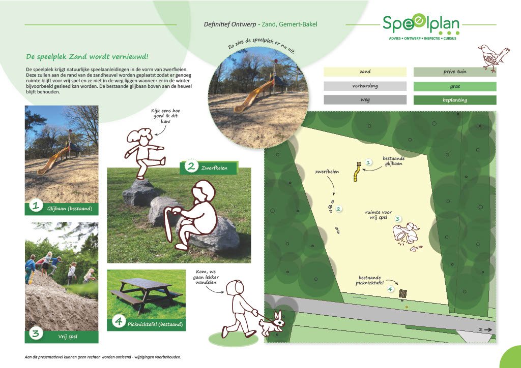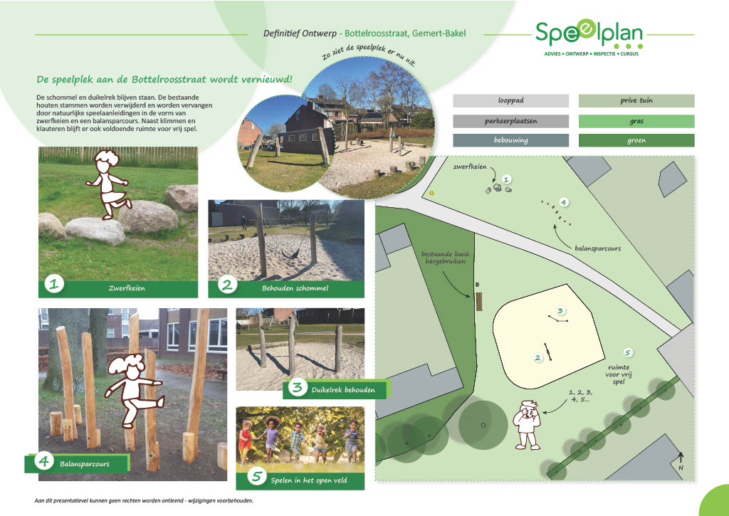 We gebruiken deze input om ontwerpen te maken voor de nieuwe speelplekken. We proberen zoveel mogelijk rekening te houden met de wensen van de buurt. Het ontwerp wordt binnenkort gedeeld op onsgemertbakel.nl, het digitale dorpsplein. Op die manier kan iedereen het bekijken en erop reageren.Â
