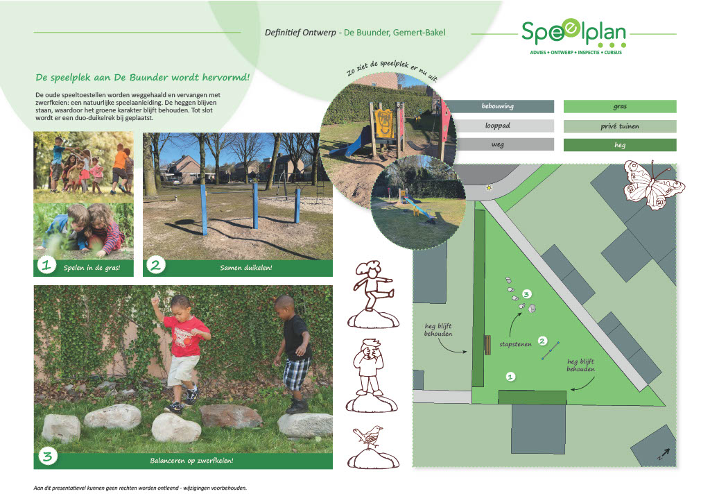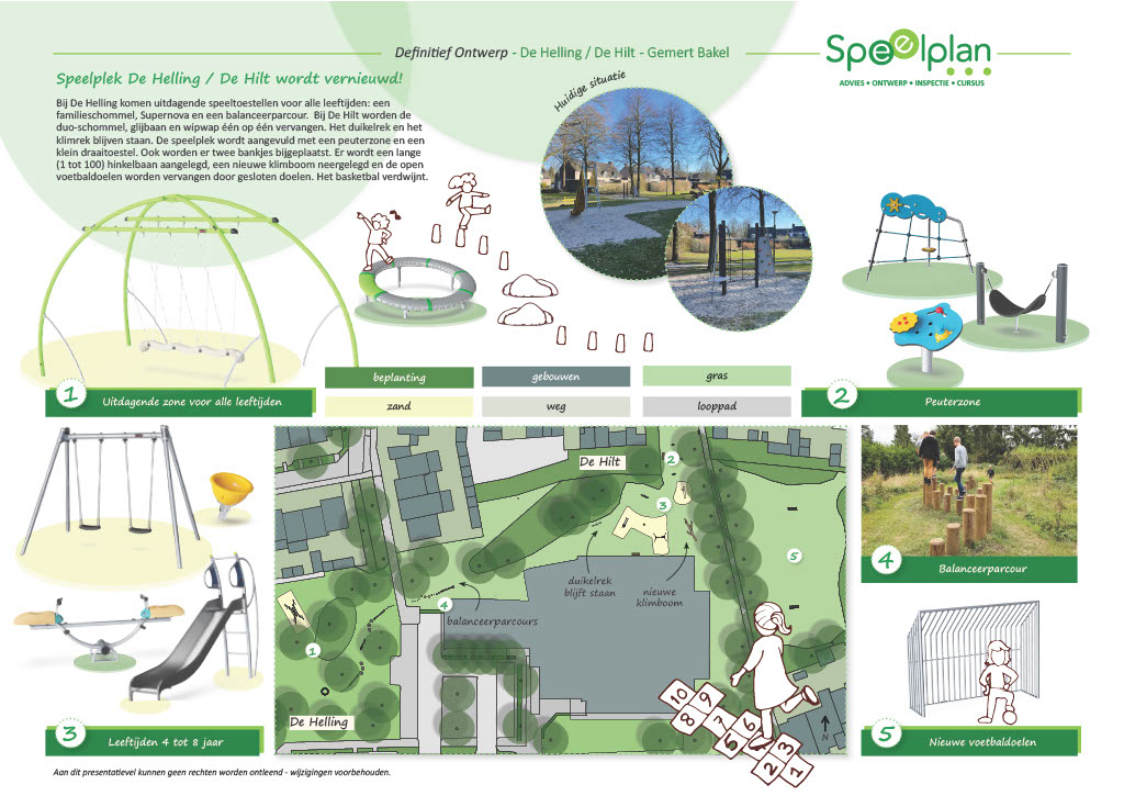 In het kader van duurzaamheid herplaatsen we sommige speeltoestellen naar een andere plek in het dorp. Zo gaan we zuinig om met de toestellen. Om welke speeltoestellen dit gaat, is terug te vinden op de definitieve ontwerpen.Â